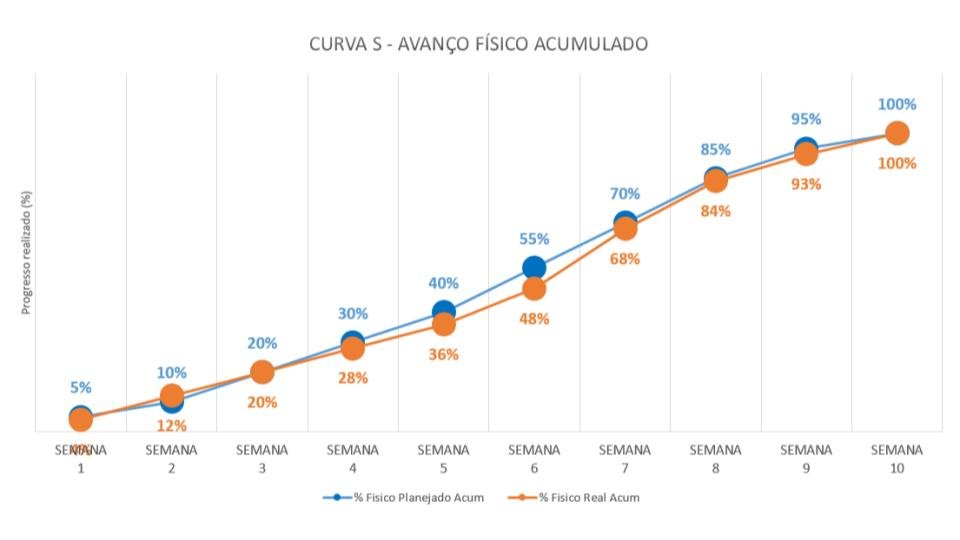 - Monitoramento de Progresso: Ao comparar a Curva S planejada com a Curva S real (que reflete o progresso atual do projeto), os gerentes podem identificar desvios e tomar medidas corretivas.