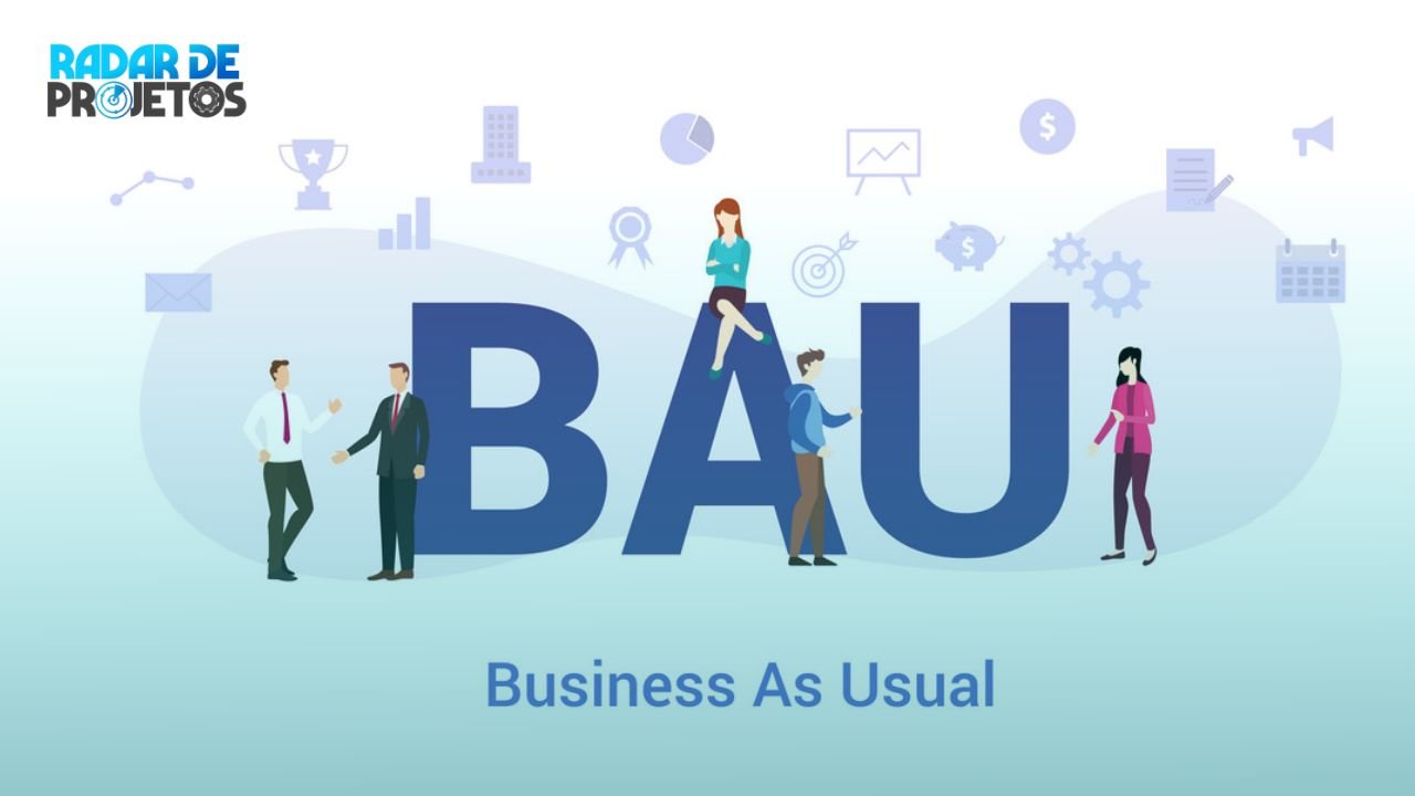 O trabalho que faz parte de uma mudança no negócio normal é conhecido como trabalho de projeto. O BAU é um trabalho de rotina, que faz parte do processo para manter a organização, ou seja, operações.